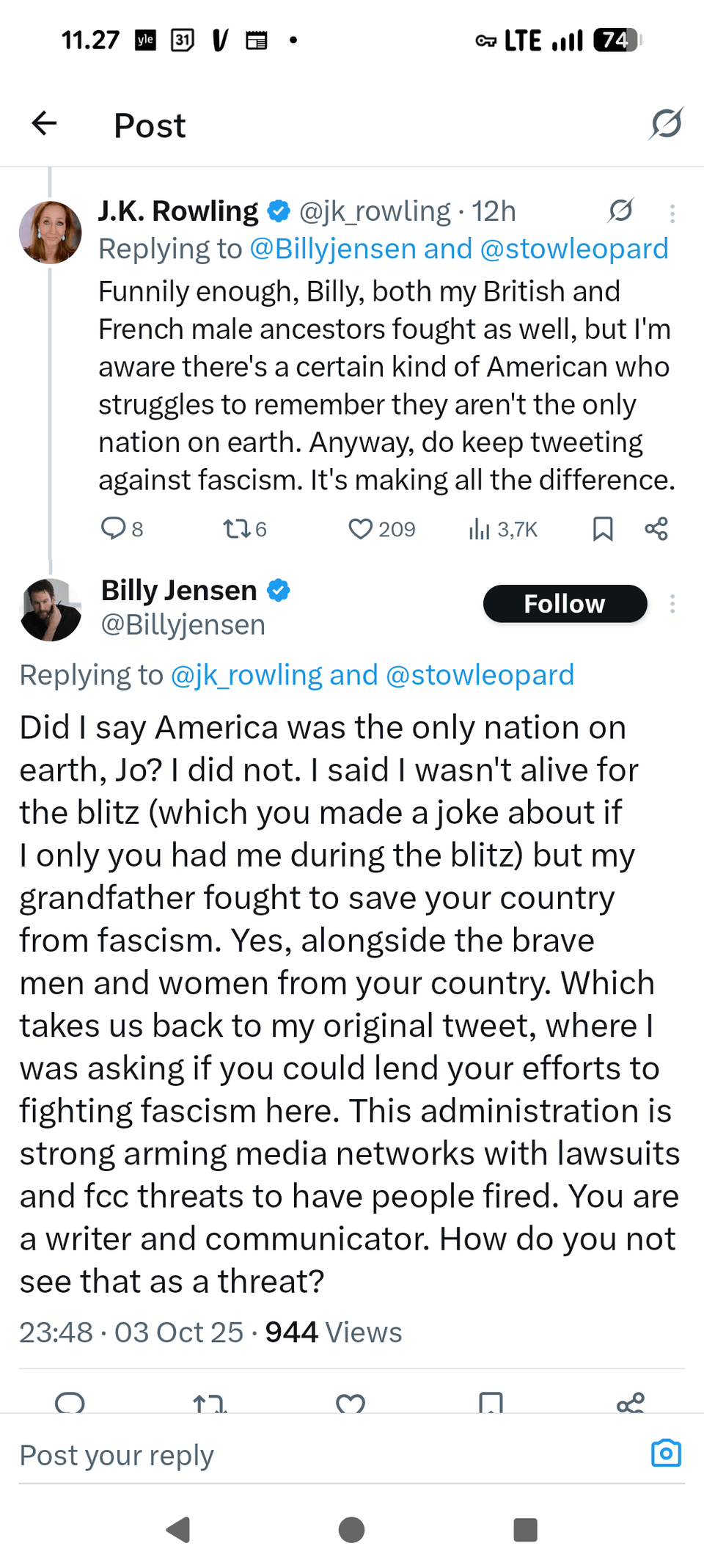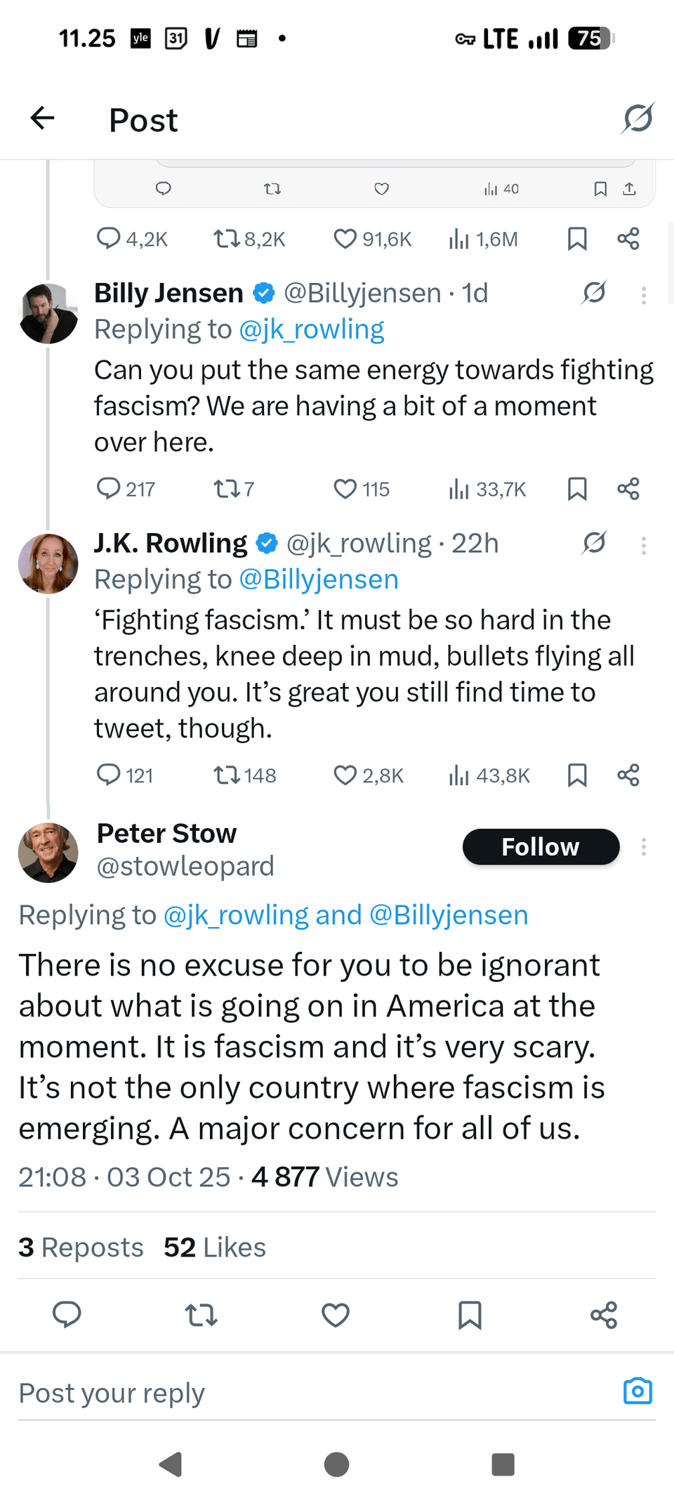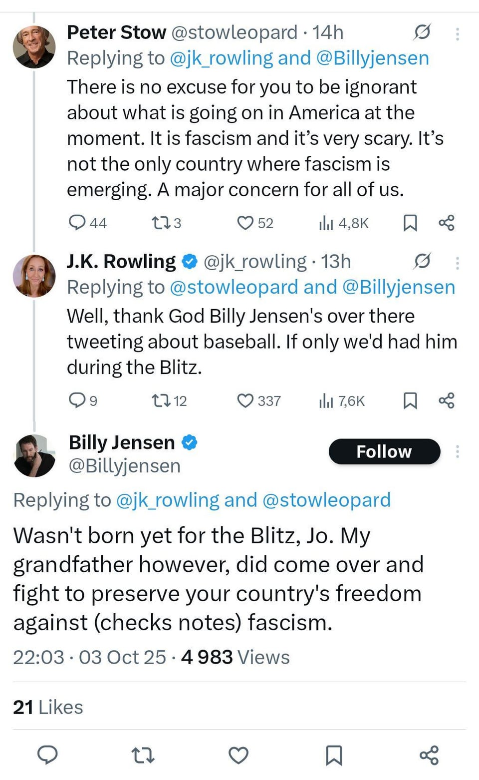 Believe me she’s very aware of what is going on and is playing dumb on purpose. She’s a horrible human being who happily got into bed with said fascists as they share the same ideology which is dehumanizing trans people and stripping them of their human rights. She doesn’t care about anything else other than that specific agenda, she pretends to care about women’s rights but she hasn’t said anything about what is currently happening to women in Palestine, the USA or anywhere else in the world.