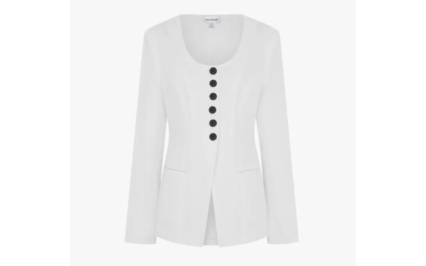 With a scooped neckline and spilt under the waist, Aligne’s linen blazer is made for pairing with high-waisted trousers or bringing refinement to a pencil dress.