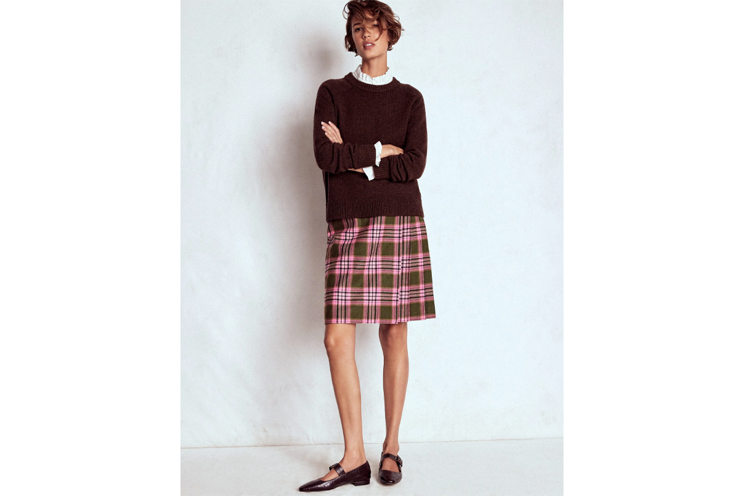 Tartan kilts were the unexpected trend to emerge from London Fashion Week – and they’re far more wearable than you might think. This woollen number from Boden is designed with a pink and green check colour palette, featuring a high-rise waist and knee-grazing length (it’s helpfully available in petite, regular and tall lengths too). Lean into the punk feel with biker boots or dress down with ballet flats.