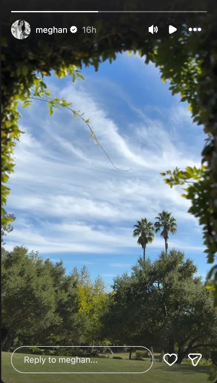 The Duchess of Sussex, 44, posted a serene video over the weekend that appeared to be taken in the backyard of her Montecito home. The short Instagram clip, uploaded on October 19, shows a dreamy blue sky with wispy clouds, lush green grass and tall trees gently swaying in the background.