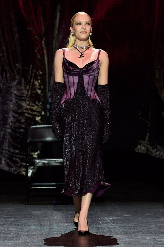 Jackie Tohn wore a instantly recognisable Wiederhoeft Spring 2024 look featuring a plum corset and black glittering skirt that captured the label’s signature theatrical sensuality. For some the opera gloves will intensify the drama, but for me, they tipped it into overkill.