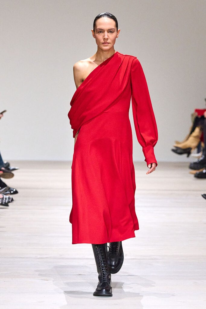 Laura Dern, who picked up the Woman of Impact award, wore an Emilia Wickstead Sehima one-shoulder draped crepe midi dress from the Fall 2025 collection. I adore the colour and draped detail, but I wish it the sleeve (or more directly the cuff) was a bit shorter — it would’ve balanced the proportions better. Still, this was a strong moment for Laura, especially paired with matching red pumps.