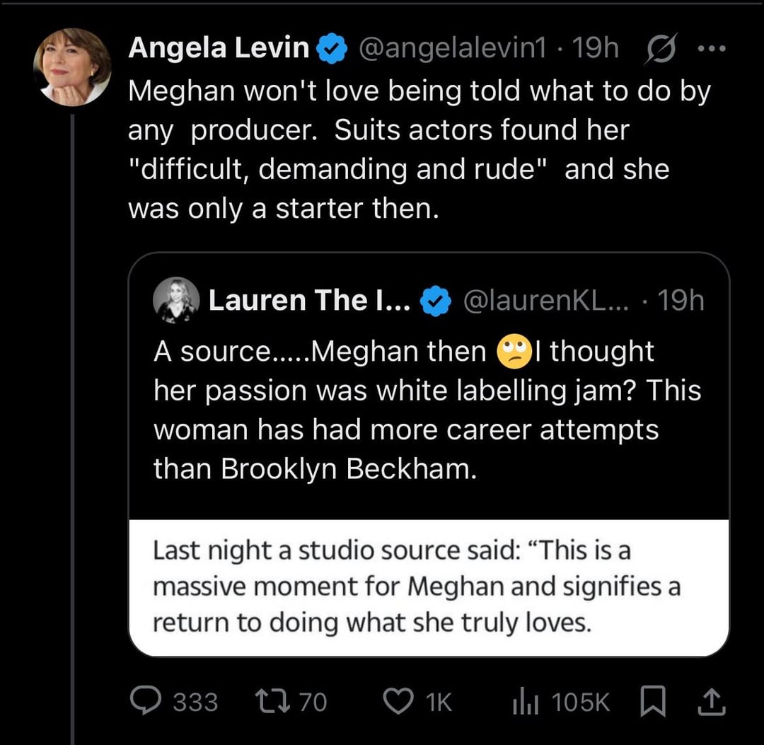 Wendell Pierce, who played Meghan’s dad on Suits, calls Angela Levin a ‘shameless hack’ on X after Levin claims that Meghan’s former costars found her ‘difficult’; says Meghan is ‘kind and giving’