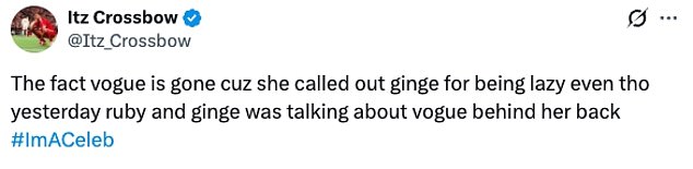 ‘Vogue was bound to leave’: ‘The fact Vogue is gone cuz she called out Ginge for being lazy even tho yesterday Ruby and Ginge was talking about Vogue behind her back’: Notice how Vogue didn’t say she didn’t dislike Aitch & Ginge? Think there’s a dislike going on there’.