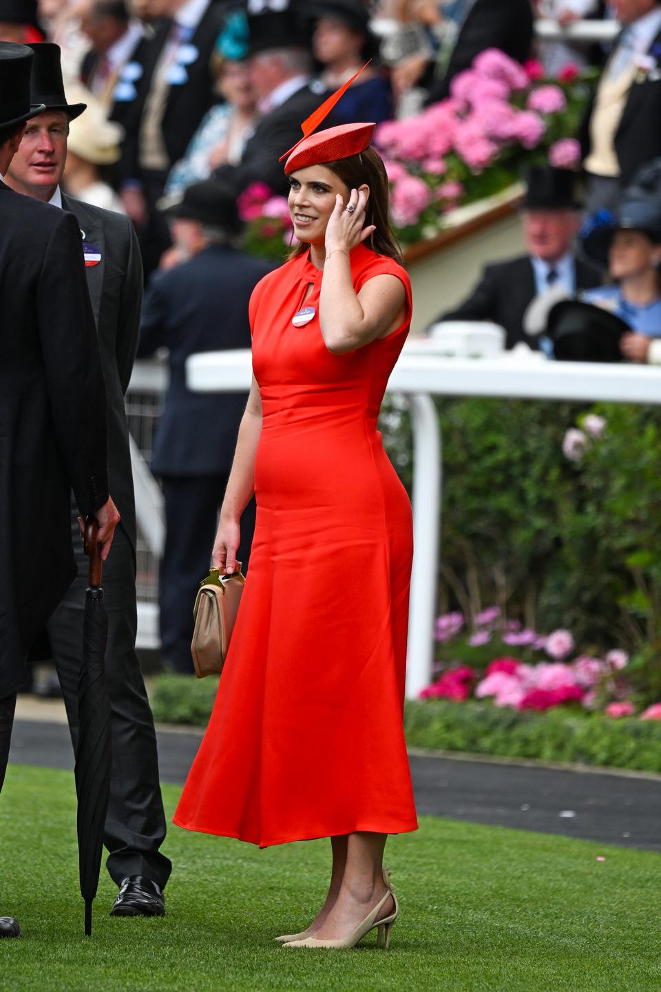 What we love about the royals in 2025, is that outfit/accessory repeating has never been more regal. On day five of Royal Ascot 2025, Princess Eugenie made a confident statement in red, wearing a twist-neck Whistles midi dress – paired with a classic Newmarket pillbox hat. She finished the look with netural accessories: her go-to M2Malletier beige handbag, which the Princess had worn only the day before (talk about sustainable fashion), and suede heels – allowing the dress to take centre stage.