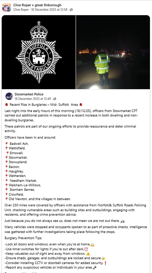 They added: ‘Over 230 miles were covered by officers with assistance from Norfolk & Suffolk Roads Policing Unit, checking vulnerable areas such as building sites and outbuildings, engaging with residents, and offering crime prevention advice.