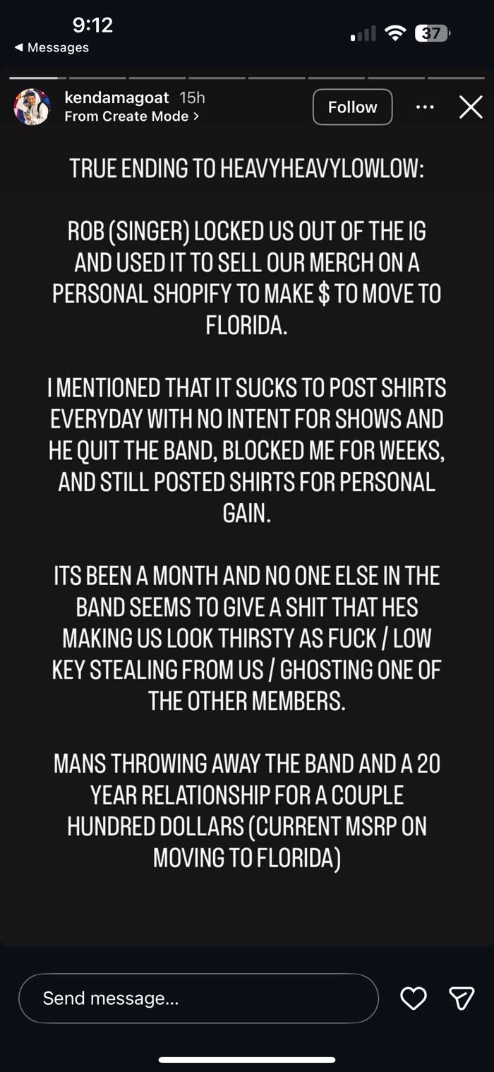 Rob (Singer) locked us out of the IG and used it to sell out merch on a personal Shopify to make $ to move to Florida.