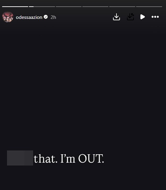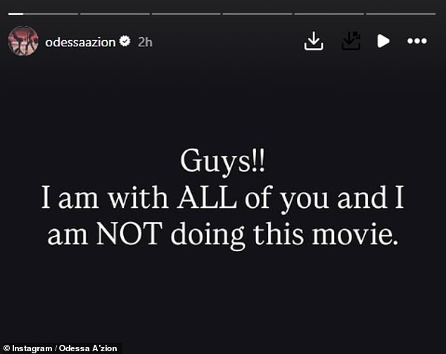 Odessa, who received a BAFTA nomination for her role in Marty Supreme, revealed she’d quit the film on Instagram, writing: ‘Guys!! I am with ALL of you and I am NOT doing this movie, f**k that I’m out!
