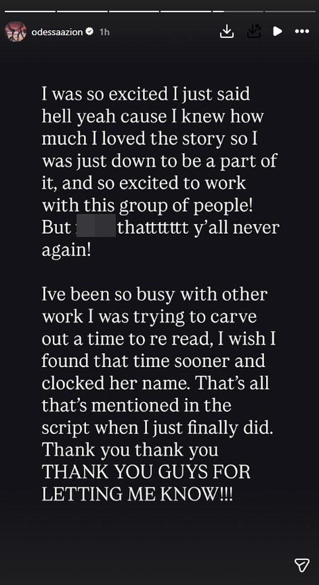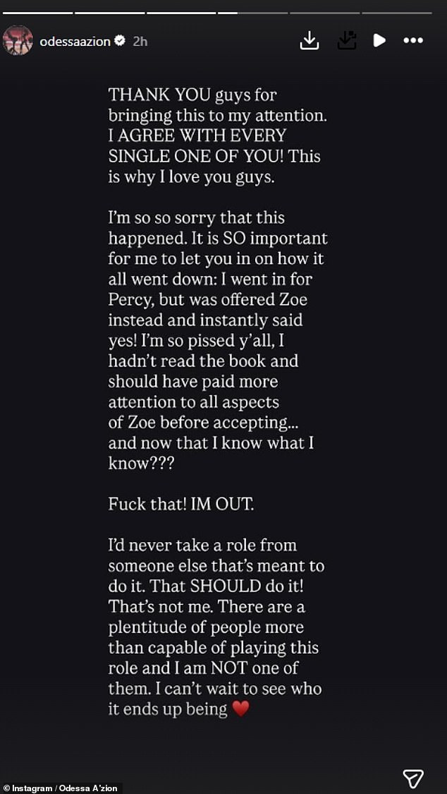 In a lengthy post on Instagram Stories, Odessa apologised to her followers and admitted she ‘hadn’t read’ the book her role was based on, and had originally auditioned to play a different part before Zoe was offered to her instead.