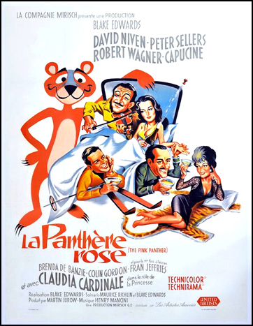 The detective first appeared in Blake Edwards’ The Pink Panther, the kind of colorful all-star cavalcade that was the rage in the early sixties—It’s a Mad, Mad, Mad, Mad World, What’s New Pussycat?, and Edwards’ own The Great Race come to mind. Though Panther was presented as a sophisticated affair filmed in an elegant widescreen format it is still a pretty square movie. It starred distinguished transatlantic mainstays like David Niven and Capucine, and up and comers like Claudia Cardinale and, lamentably, Robert Wagner.