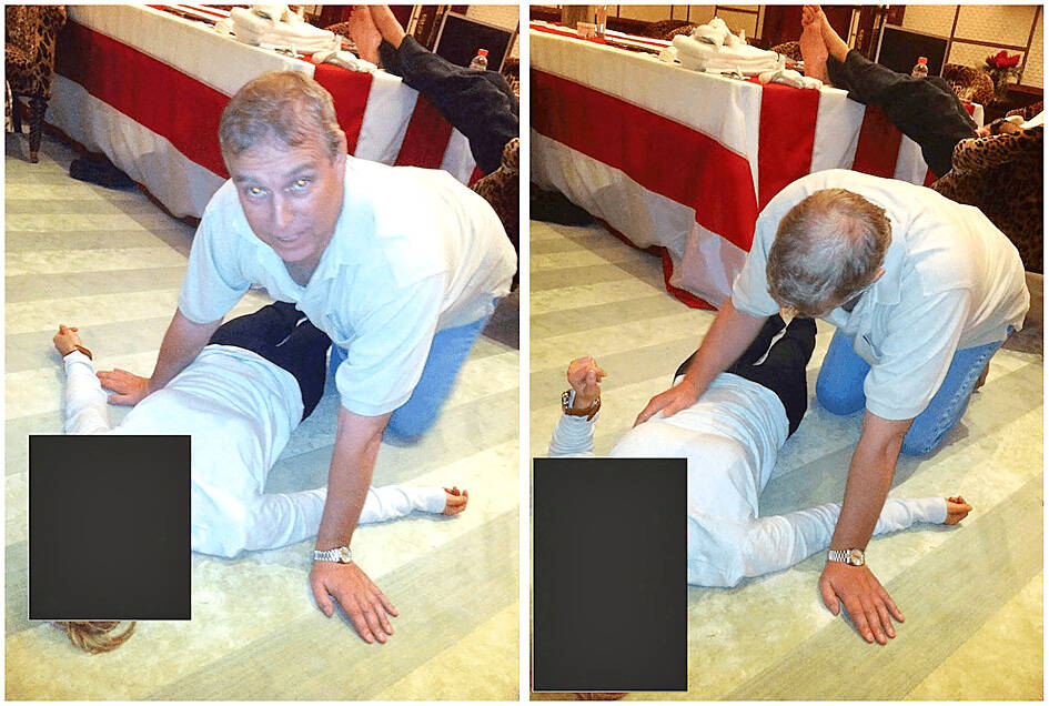 Also included are three photographs that show someone who looks like Mountbatten-Windsor kneeling over an unidentified person whose face is redacted.