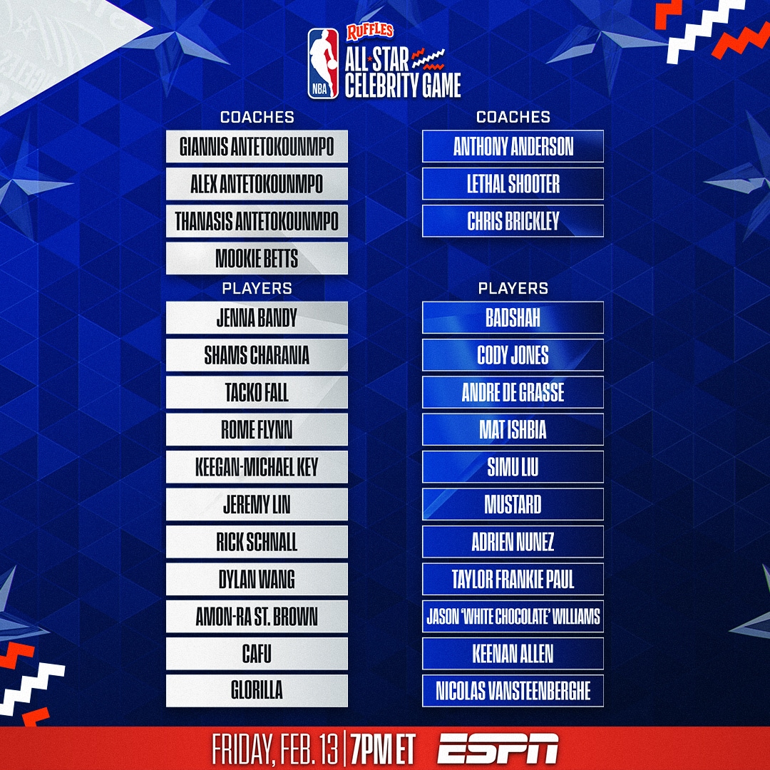 Player rosters for the 2026 Ruffles NBA All-Star Celebrity Game will include: actor, writer and producer Keegan-Michael Key, multi-platinum rapper and Indian entertainment icon Badshah, multi-platinum producer Mustard, multi-platinum rapper GloRilla, NBA legend and champion Jeremy Lin,  ABC’s “The Bachelorette” and Hulu’s “The Secret Lives of Mormon Wives” star Taylor Frankie Paul, “Love Island USA” standout Nicolas Vansteenberghe, ESPN Senior NBA Insider Shams Charania, Los Angeles-native and All-Pro NFL wide receiver Amon-Ra St. Brown, six-time NFL Pro Bowler and Los Angeles Chargers star Keenan Allen, Brazilian soccer legend and two-time FIFA World Cup champion Cafu, creator and co-founder of Dude Perfect Cody Jones, social media creator and basketball personality Jenna Bandy, singer-songwriter and viral hitmaker Adrien Nuñez, 7-foot-6 former NBA player Tacko Fall, Phoenix Suns Chairman and Governor Mat Ishbia and Charlotte Hornets Co-Chairman and Governor Rick Schnall.