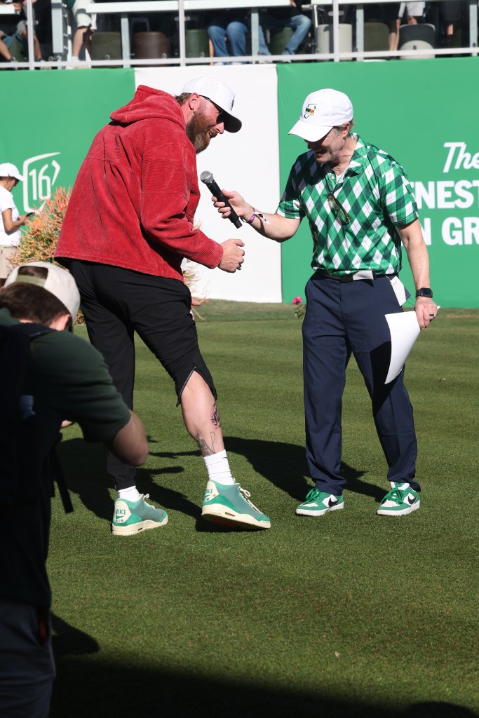 Kansas City tight end Travis Kelce drew the biggest gallery and wowed the crowd at the 16th hole with a tee shot that landed a few feet short of the pin. Country singer Zach Top was also popular and managed to survive his greatest fear.