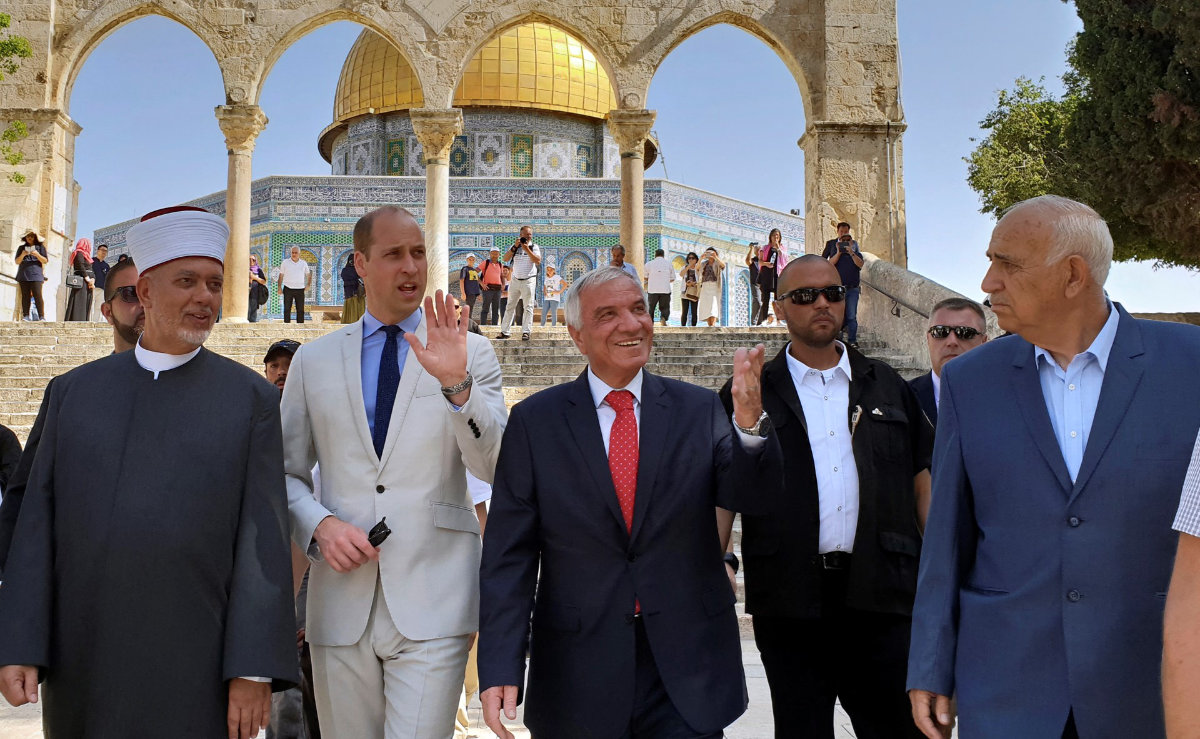 Britain’s Prince William (2nd L) accompanied by a group including Sheikh Azzam al-Khatib, director of the Islamic Waqf (C), in Jerusalem visits the Al-Aqsa mosque compound in Jerusalem’s Old City on June 28, 2018. (AFP)