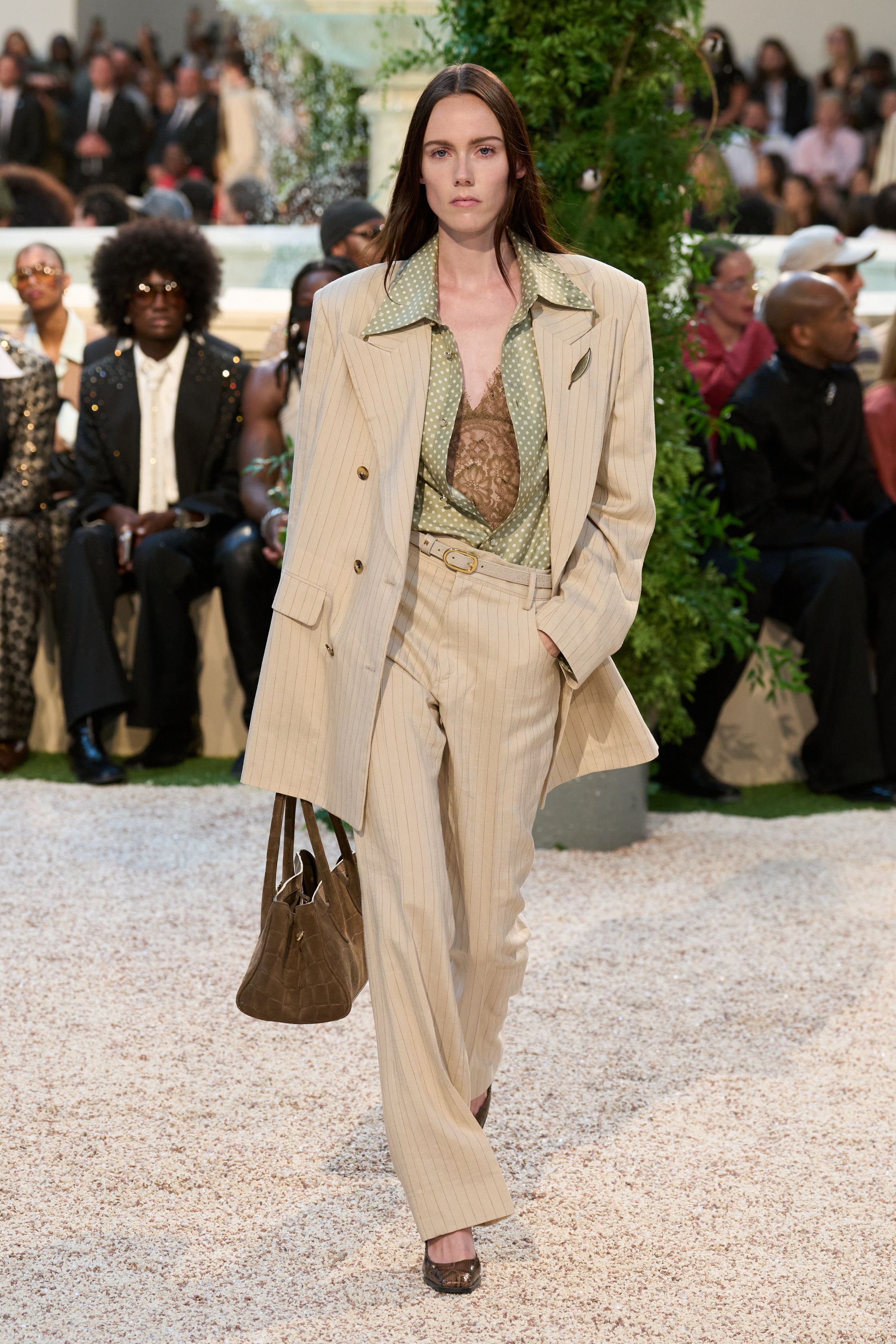 The soft tailoring and relaxed proportions already set it apart, but it’s the styling – the brown polka-dot shirt (over the green from the runway), snakeskin pumps and lace bra peeking through – that adds personality and a subtle edge to the look.