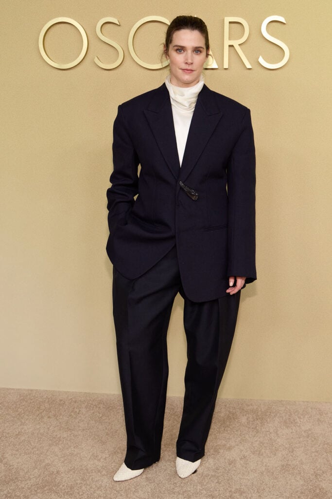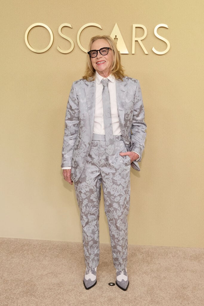 Amy Madigan is having an exceptional run in tailoring this awards season, and this shimmering silvery grey Thom Browne suit continues that momentum.