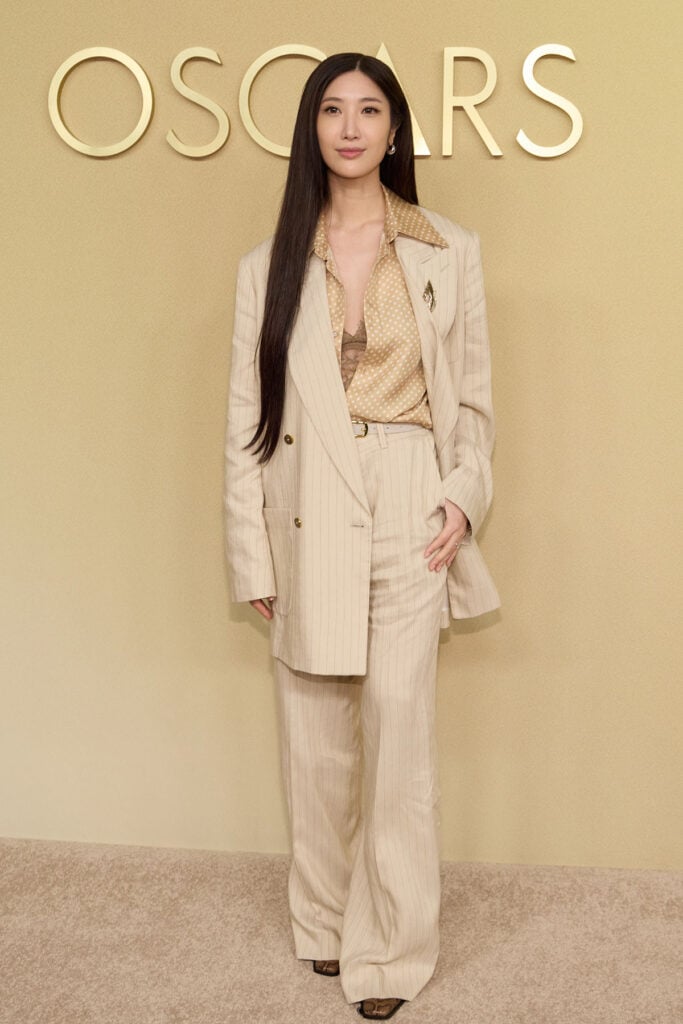 Considering how many dark hues dominated this red carpet, EJAE’s cream AMIRI Spring 2026 pinstripe suit felt like a breath of fresh air.