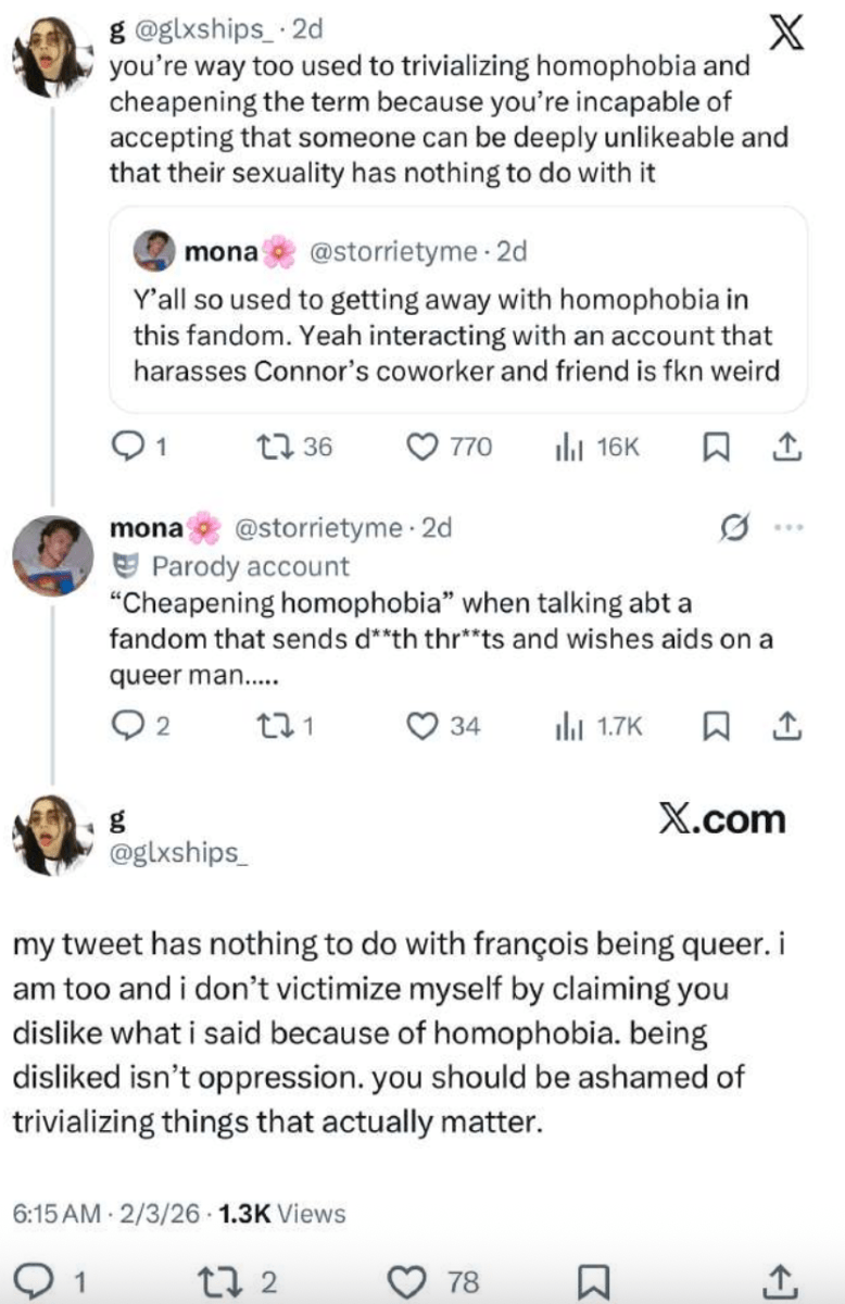 The PDF is full of screenshots of posts from X teeming with vitriol, homophobia, and lies. The more it’s talked about, the more it gains traction from those who want to blindly believe what others say just because they fear their fictional ship is in danger. They say Arnaud cheated on his ex-partner. They call him a hag. They trash him for defending himself online. They perceive him as a wedge between their faves, when the reality is that he is probably just as close to Williams and Storrie as they are to each other.