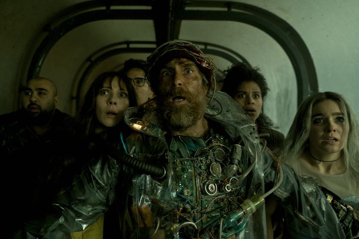 In the opening moments of the gonzo sci-fi action-adventure comedy Good Luck, Have Fun, Don’t Die, a wild-eyed character played by Sam Rockwell bursts into a Los Angeles–area diner with a bizarre hostage demand. Six randomly selected patrons must help him save humanity from marauding artificial intelligence or everyone in the restaurant dies via suicide vest. Claiming to have beamed in Terminator style from the dystopian, not-too-distant future, Rockwell’s twitchy, rubber-faced Man From the Future (that’s his name according to the credits) possesses an uncanny familiarity with all the diners at Norms; he says he’s already been to this very restaurant 117 times trying to stop the apocalypse. Soon, he’s rounded up six ill-prepared and mostly disbelieving randos (Zazie Beetz, Michael Peña, Haley Lu Richardson, and Juno Temple among them), who embark on what could be a suicide mission where they will encounter forces both wondrous and baffling: facing off against a legion of social-media-addicted Gen-Alpha quasi zombies, biomorphic mountains of murderous toys, and a brontosaurus-size cat creature with even more disproportionately massive genitals (not to mention a bottomless appetite for human flesh).