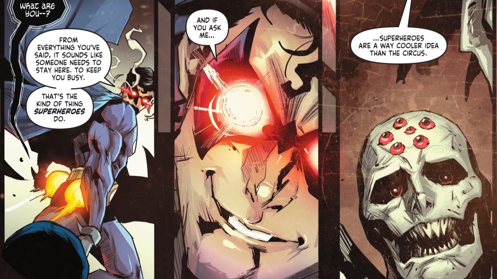 With a positive one, of course! In the same way that the Zanni represents the birth of entertainment and imagination, Nightwing-Prime represents the evolution and change of entertainment. More than that, he’s someone who wholeheartedly embraces superheroes and the idea of being one. Nightwing-Prime knows that by staying behind, he’s losing out on his life. But at the same time, Bryce knows that heroism isn’t just about spectacle and dazzle. It’s about making the sacrifices that need to be made, like Nightwing-Prime using everything at his disposal to keep the Zanni from breaking out.