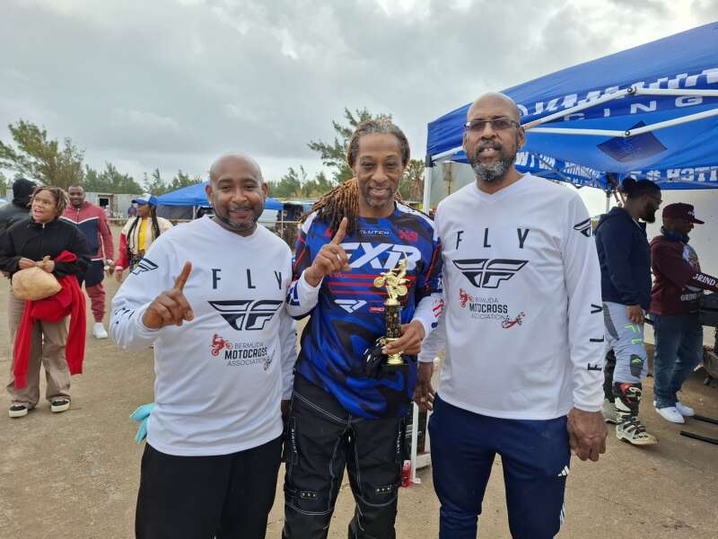 L-R: Bermuda Motocross vice-president Jamal Thompson, Fire Wayne, centre, and association president Gannon Trott (Photograph by Colin Thompson)