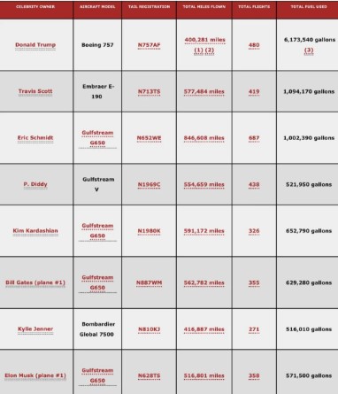 The list from CelebrityPrivateJetTracker.com, which was sorted by total CO2 pollution generated by the flights, showed President Donald Trump at the top. He has taken 480 flights and burned over 6 million gallons of fuel — over five times as much as Travis Scott, who was next on the list.