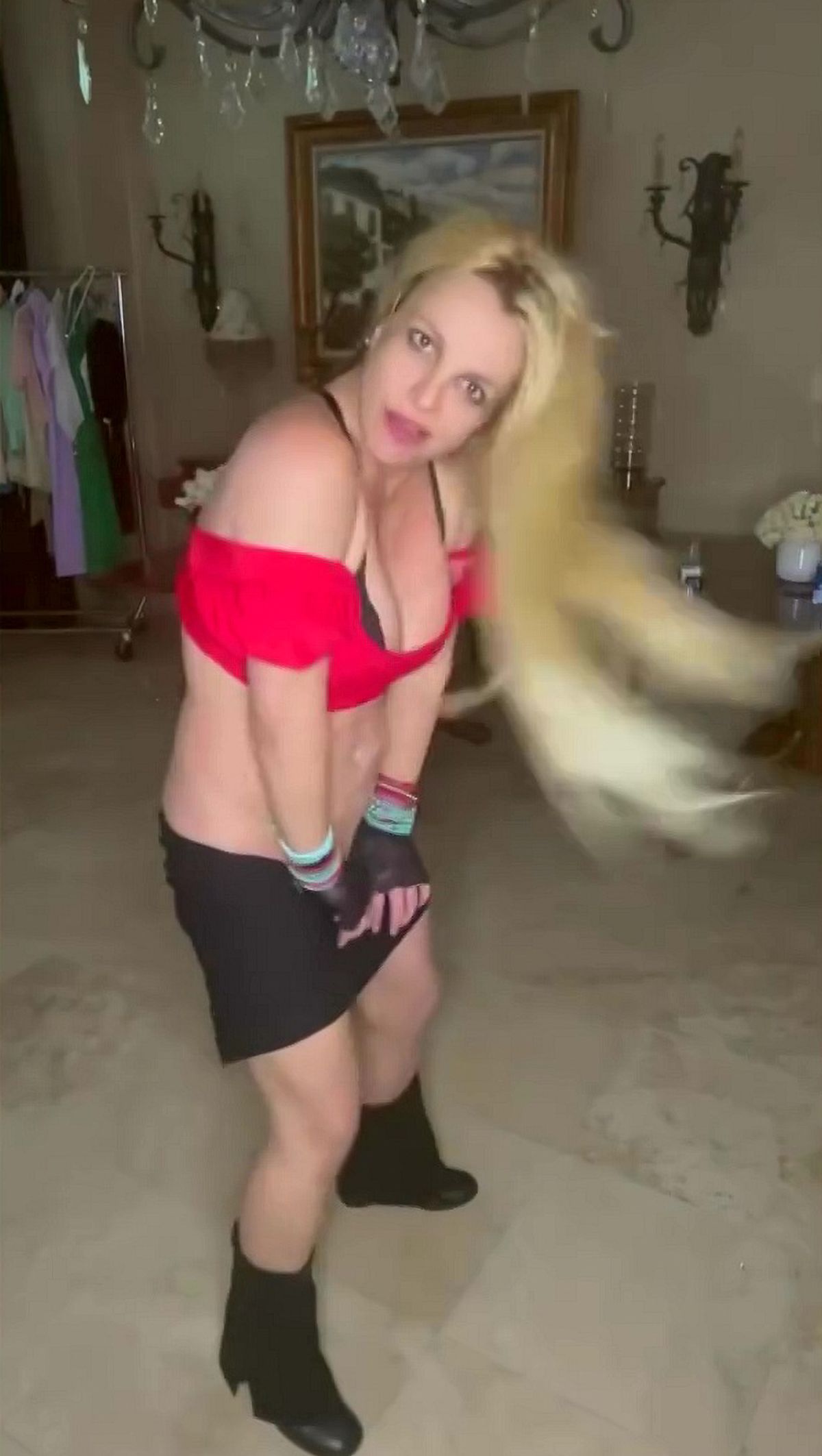 Britney Spears dialled up the heat as she danced in a tiny black bra. The pop sensation showed off her killer figure in the halterneck bra, a red crop top and a black miniskirt as she shook her hips to Billie Eilish’s hit song Bad Guy.