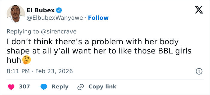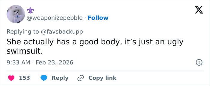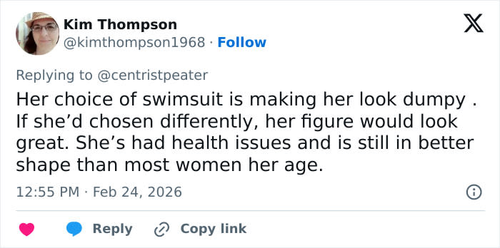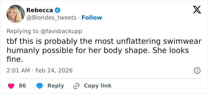 “tbf this is probably the most unflattering swimwear humanly possible for her body shape. She looks fine,” one said.