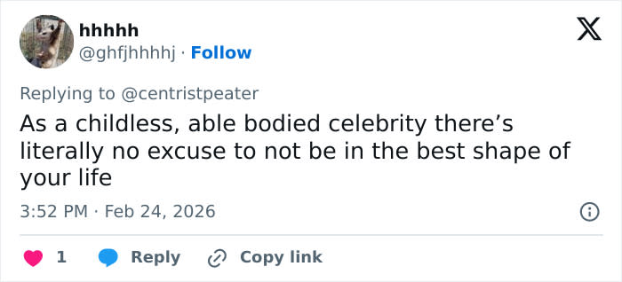 “As a childless, able-bodied celebrity, there’s literally no excuse to not be in the best shape of your life,” another claimed.