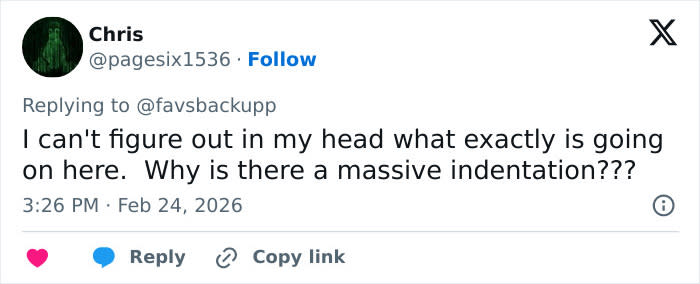 “I can’t figure out in my head what exactly is going on here. Why is there a massive indentation???” read one comment online