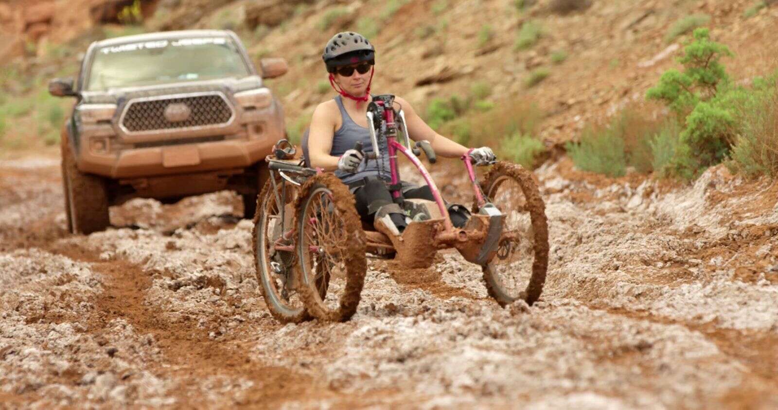 Danielle Doelling trains to handcycle 87 miles across the rugged terrain of the White Rim Trail in Canyonlands National Park, Utah. (Courtesy of Paul Bikis)