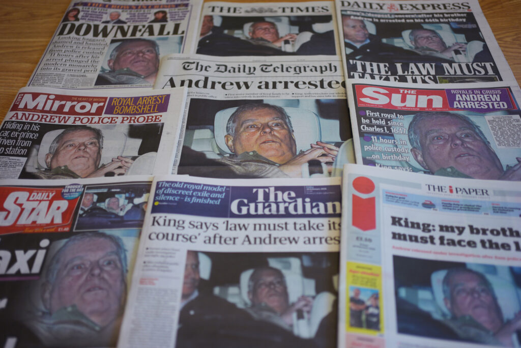 The front pages of national newspapers on display in London showing Andrew Mountbatten-Windsor leaving Aylsham Police Station. Photo credit: Yui Mok/PA Wire