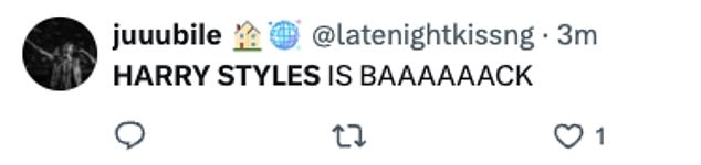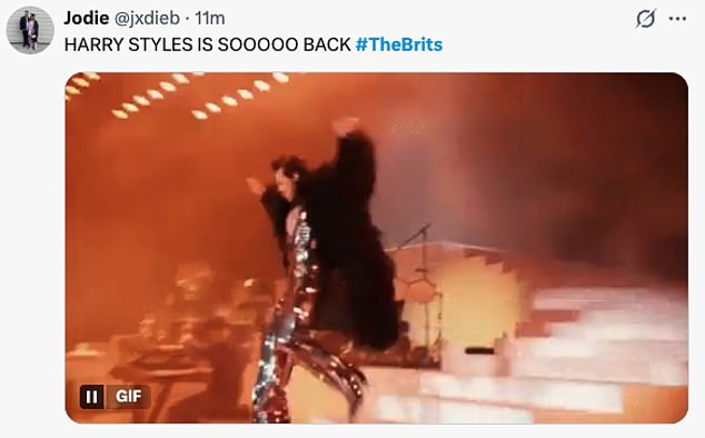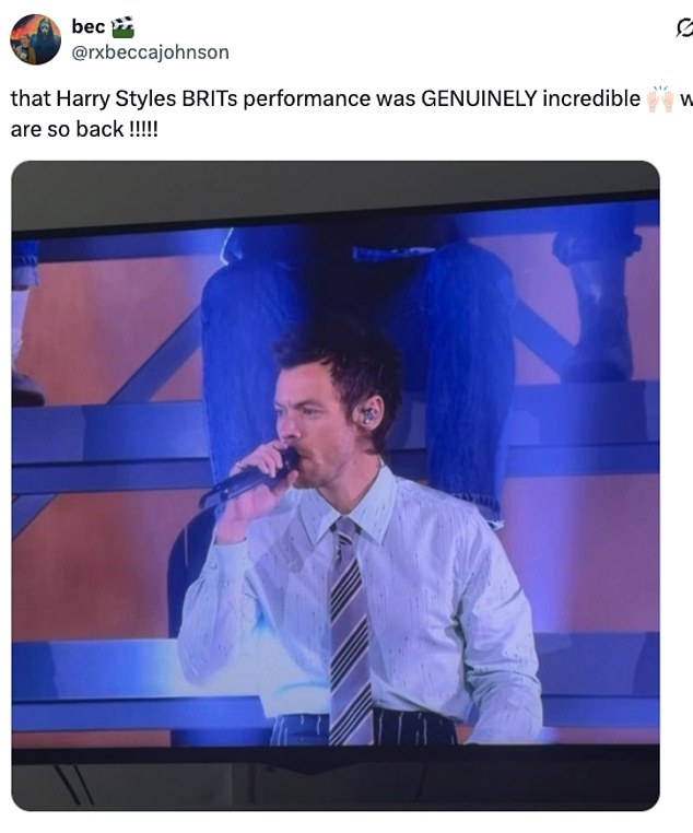 Fans rushed to social media, gushing: ‘He is so back!’: ‘That Harry Styles BRITs performance was GENUINELY incredible we are so back !!!!’: ‘HARRY STYLES ATE SO HARD’: ‘I just love harry styles’: ‘HARRY STYLES IS BAAAAAACK’: ‘