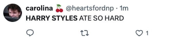 ‘That was an EXTRAORDINARY performance from Harry Styles! The dancing, the dancers, the hands shaking, the gospel singers! He really levelled up and got a standing, screaming ovation from the audience! So unbelievably proud’.