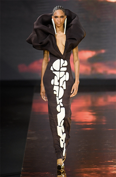 I love Janelle James’ detour in this Do Long Spring 2026 look among a sea of gowns. I do not feel it needed the gold fine crystal threaded bra, as the rich colour, exaggerated collar and hook-and-ring embellishments give the look more than enough drama.
