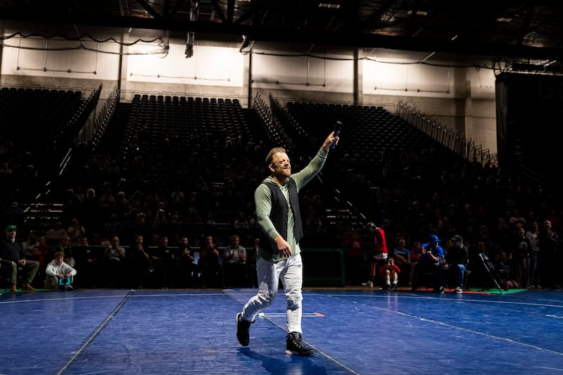 Ben Kjar, a professional wrestler and emcee of the event, gestures to the crowd after speaking before the Ross Brunson All-Star Duals held at the UCCU Center in Orem on Tuesday, Jan. 6, 2026. | Isaac Hale, Deseret News