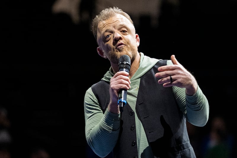 Ben Kjar, a professional wrestler and emcee of the event, speaks before the Ross Brunson All-Star Duals held at the UCCU Center in Orem on Tuesday, Jan. 6, 2026. | Isaac Hale, Deseret News