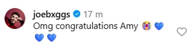 Charlotte Crosby added: ‘Congratulations, so beautiful’ and Gogglebox’s Joe Bagg said: ‘OMG congratulations Amy’.