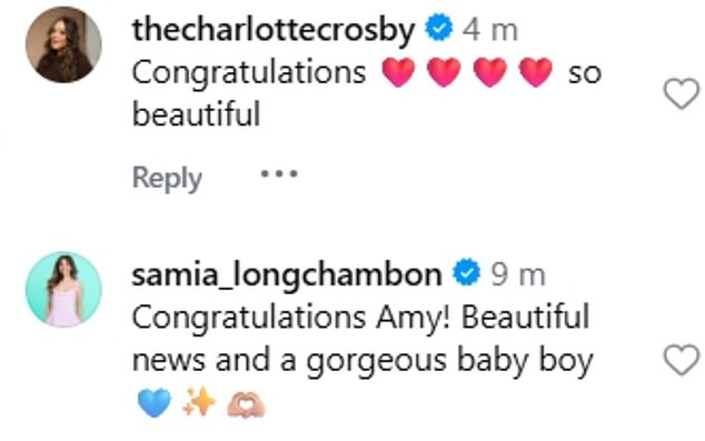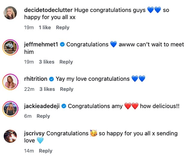 Fans and famous friends were quick to share their congratulations, with Corrie’s Samia Longchambon gushing: Congratulations Amy! Beautiful news and a gorgeous baby boy’.