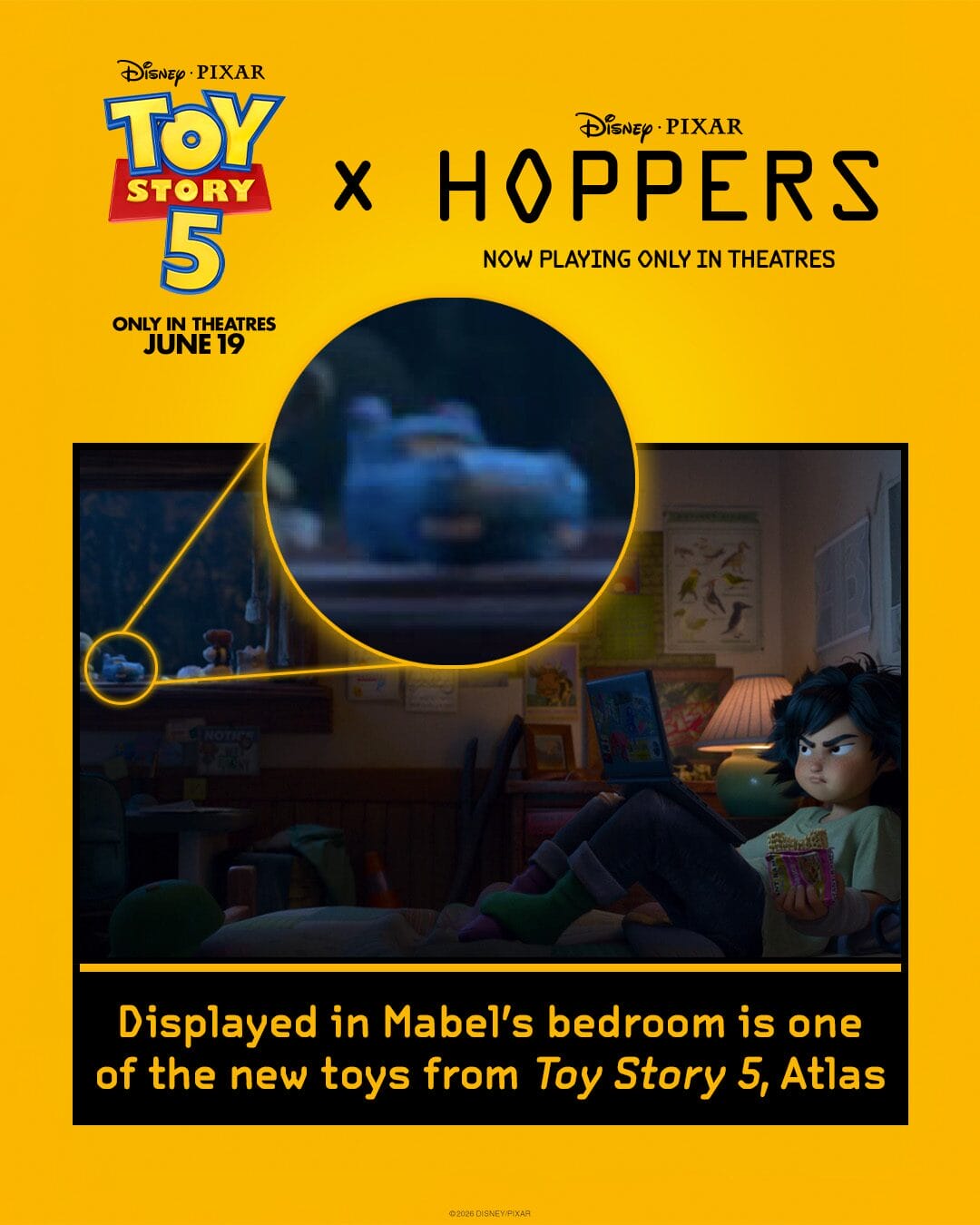 There is a very brief moment while Mabel is in her bedroom on her laptop that we can see a quick character reference to the forthcoming Toy Story 5. This new character is Atlas, a talking GPS hippo toy from the movie, voiced by Craig Robinson.