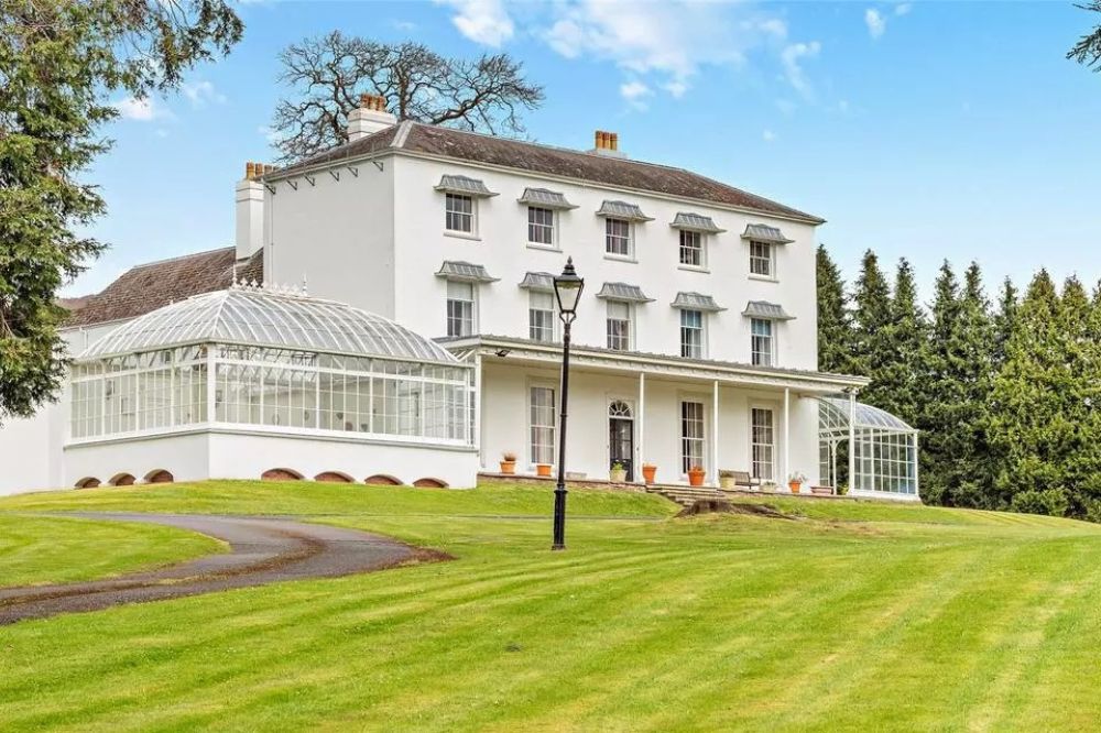 “There were later graceful Victorian additions of a domed cast iron orangery and a second veranda, with their impressive curved glass structures hugging the sides of the main house. The natural slate roof is a slim hipped style and the house was extended to the rear with dual wings.”