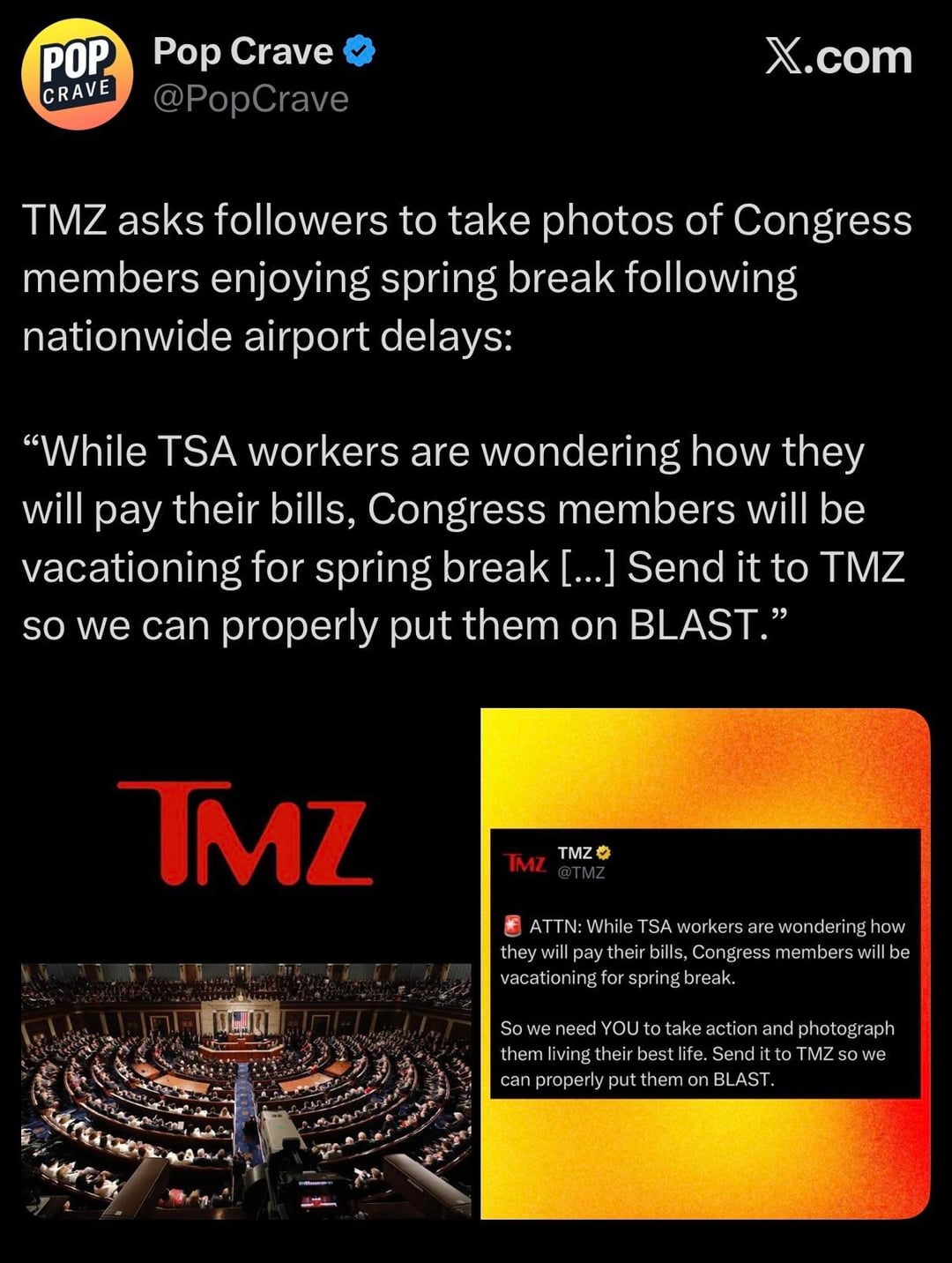 TMZ asks followers to take photos of Congress members enjoying spring break following nationwide airport delays: “While TSA workers are wondering how they will pay their bills, Congress members will be vacationing for spring break… Send it to TMZ so we can properly put them on BLAST.”
