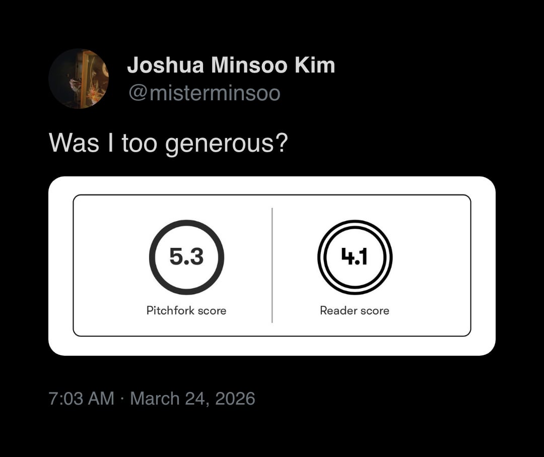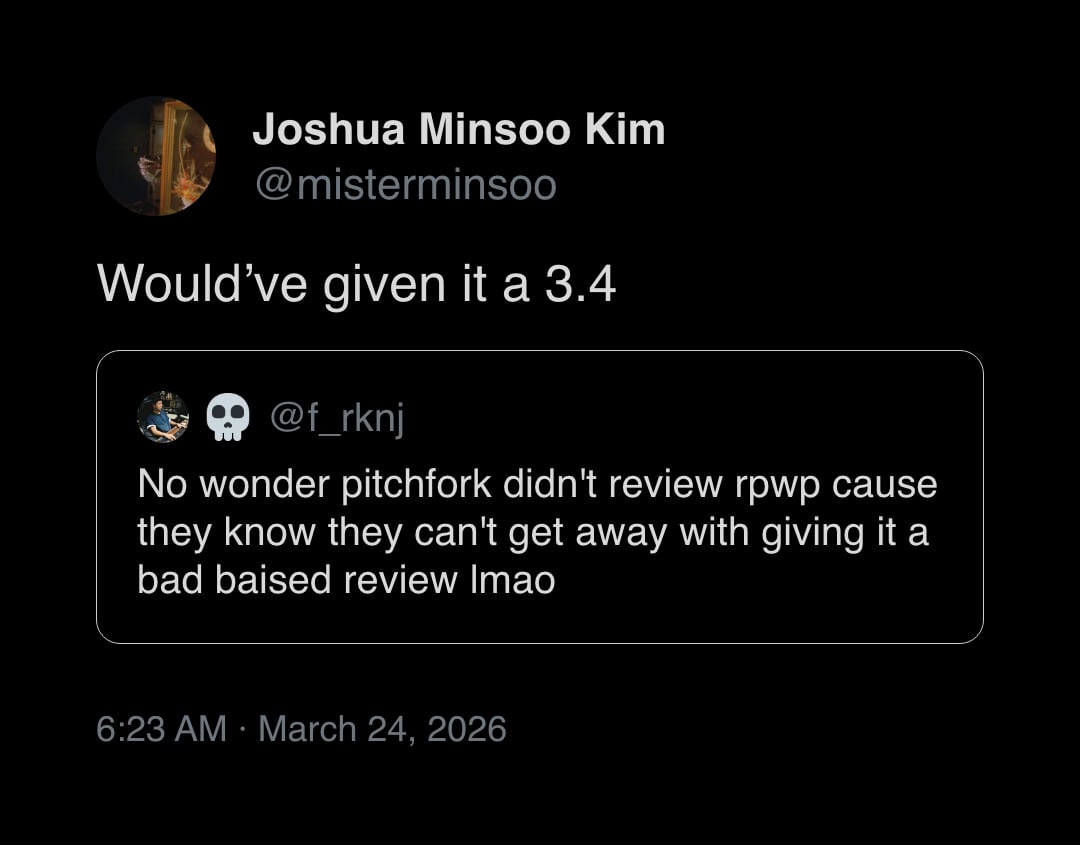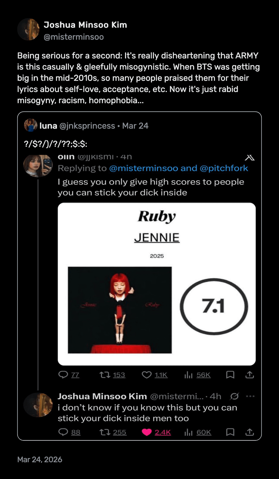 They are acting as if Jennie’s album is the highest rated kpop album on Pitchfork. Which is not, they gave higher ratings to Red Velvet, Twice and NewJeans. They even gave previous BTS albums about the same rating as Ruby. They thought their new album sucked, why is this Jennie’s problem?