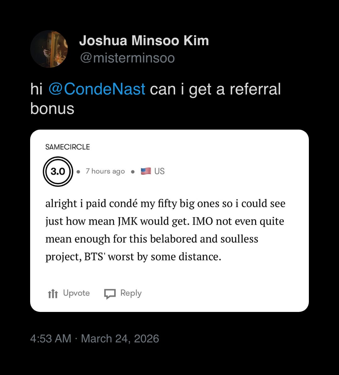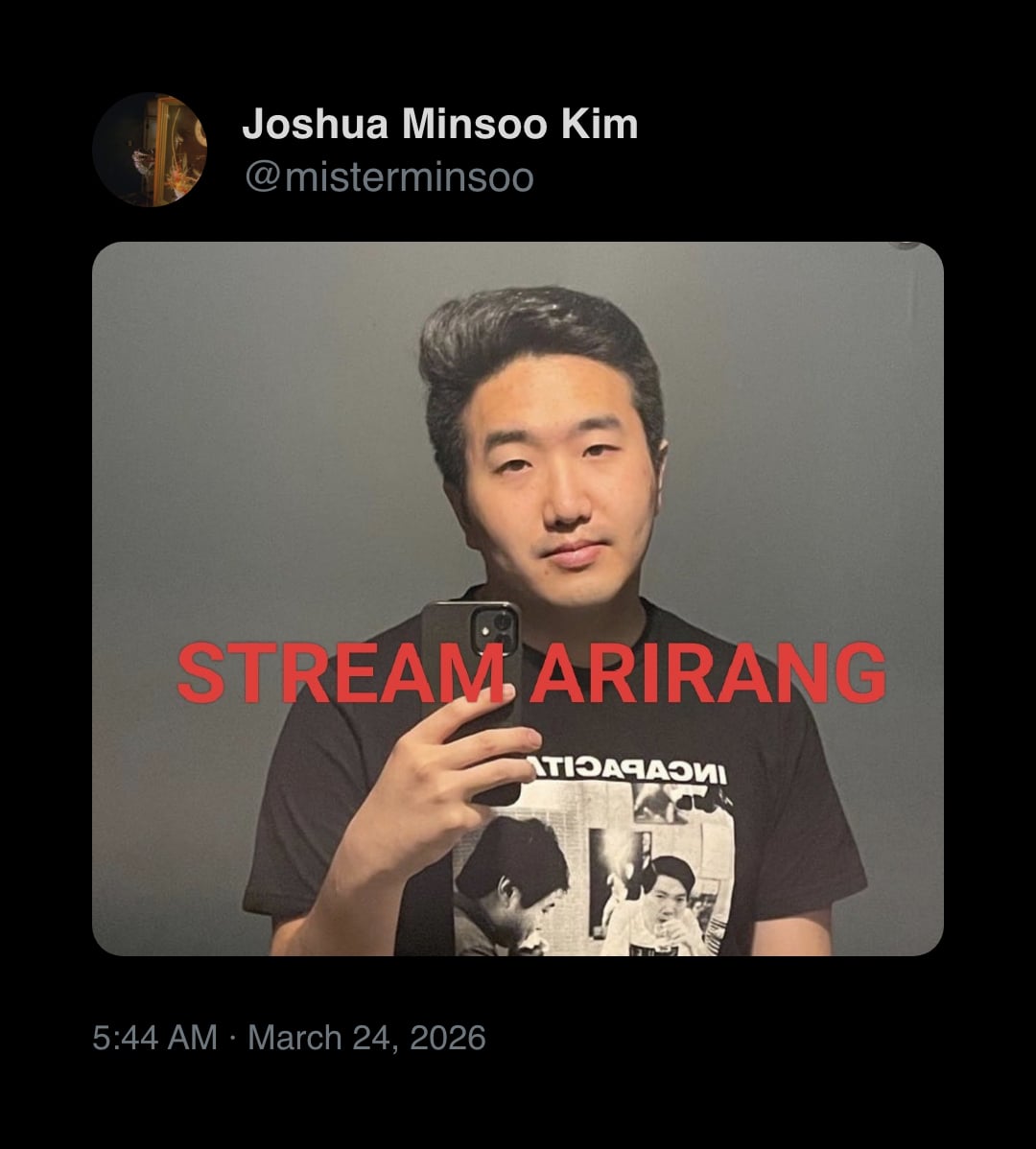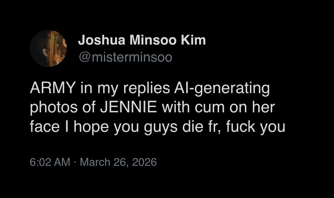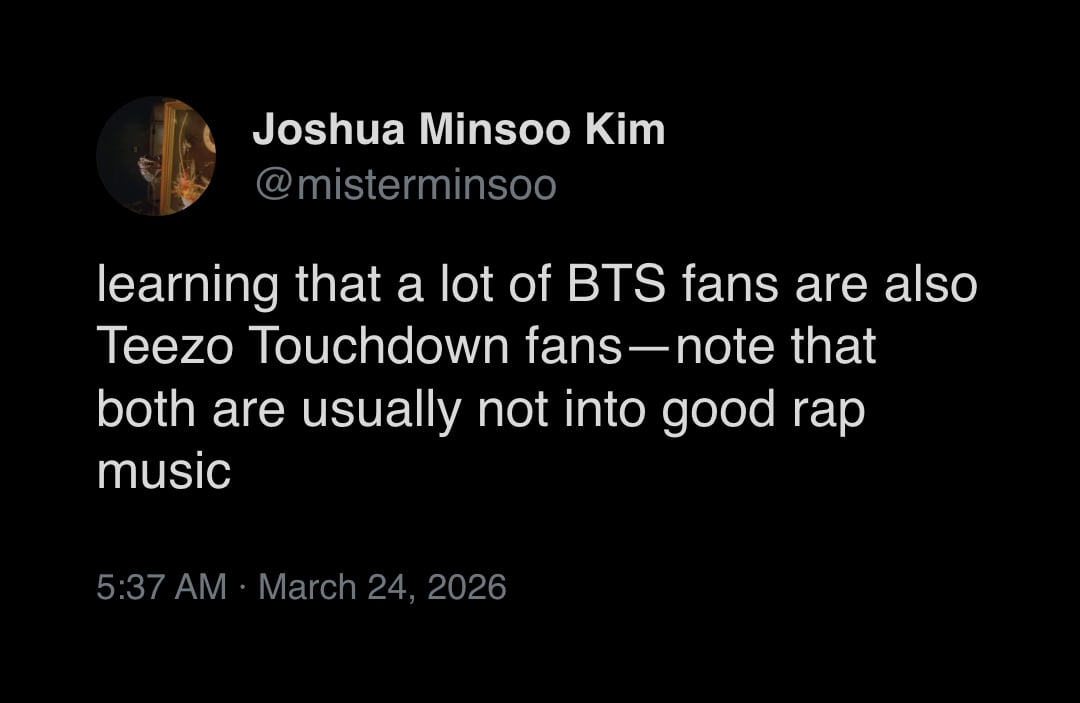 My main takeaway from this is that both Joshua Minsoo Kim and some BTS fans spend entirely too much time on Twitter. The hate he’s getting is inexcusable, obviously, but his posts are also pretty cringe. Smug edgelord vibes.