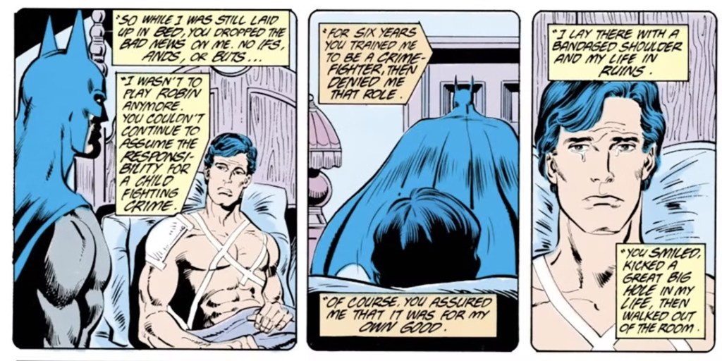 The post-Crisis on Infinite Earths story sees Batman and Dick’s Robin fight the Joker and Robin gets shot. The incident freaks Batman out so much that he decides to fire Dick for his own safety. Dick’s response is an uncharacteristically juvenile comic book version of “yeah, well you can’t stop me!” which prompts him to become Nightwing. The issue leads to Batman meeting Jason Todd.