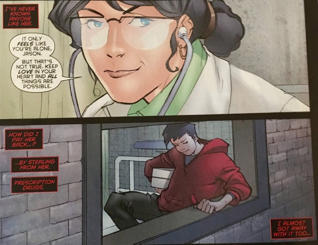 In Red Hood and the Outlaws #0, DC retconned Jason’s origin to have him trying to steal drugs from Dr. Leslie Thompkins. It was an elaborate way of tying in other drug-related elements of Jason’s life, as post-Crisis his mother was said to have died of a drug overdose so having Jason also be stealing drugs was a logical fit. Leslie insists that Batman not turn Jason in and somehow that leads to Jason becoming Robin. Yeah, it never made sense to us, either.