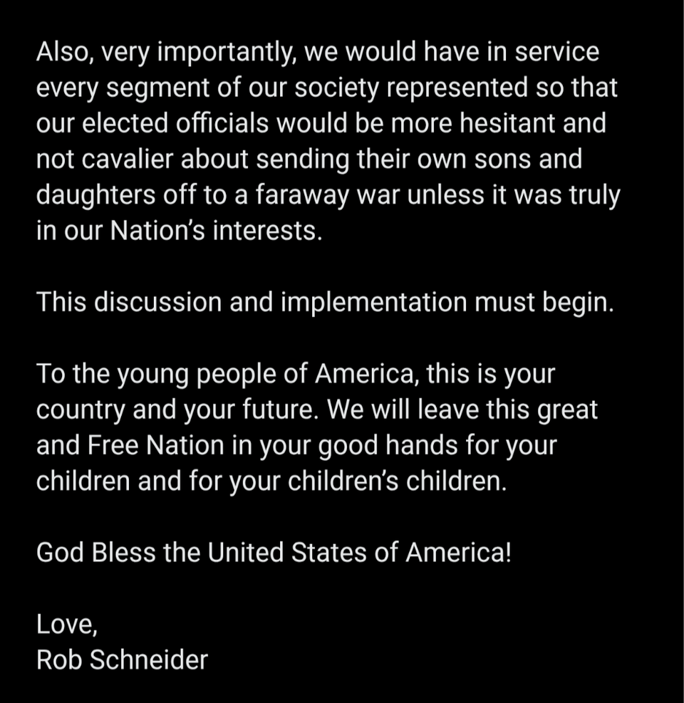 Not him confusing the concept of reinstating the draft with mandatory military service. So no, Rob Schneider, we should probably keep sending our young people to Universities instead. Woof