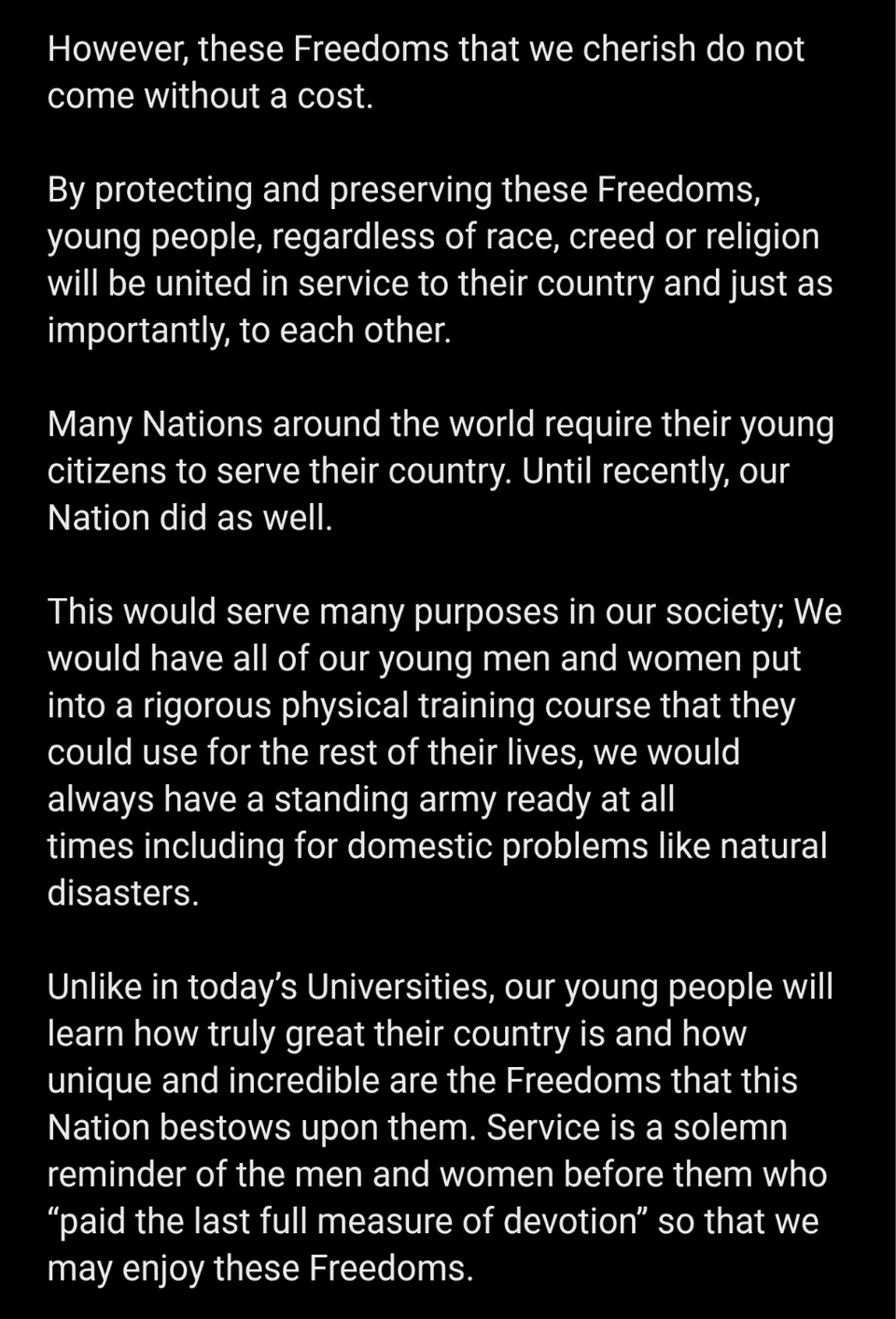 That would be 3.6M new recruits every year, so 7M privates floating around. Roughly 4x our total military today. You’ll need thousands more officers to manage them. What pray tell will they do?? What’s the cost?
