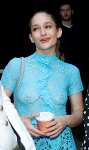 Jemima Kirke turned heads in this sheer, vibrant blue lace dress at the Proenza Schouler show for NYFW!