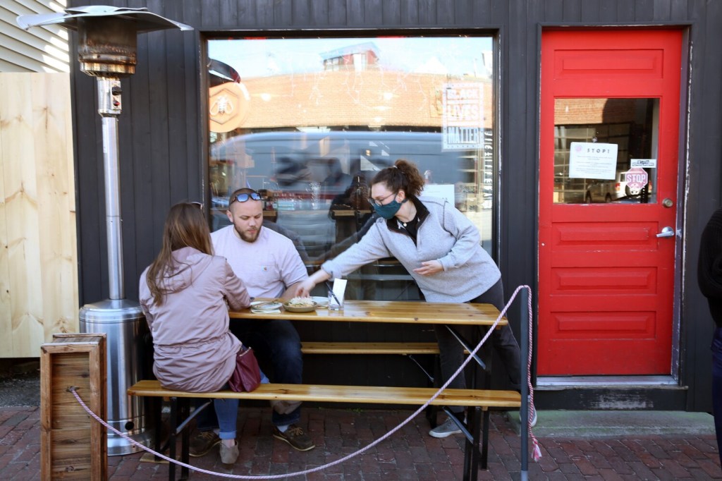 Eva Thornton, right, serves food to Ben and Theresa Batty of Albany, New York, at Izakaya Minato’s outdoor seating in April 2021. (Ben McCanna/Staff Photographer)